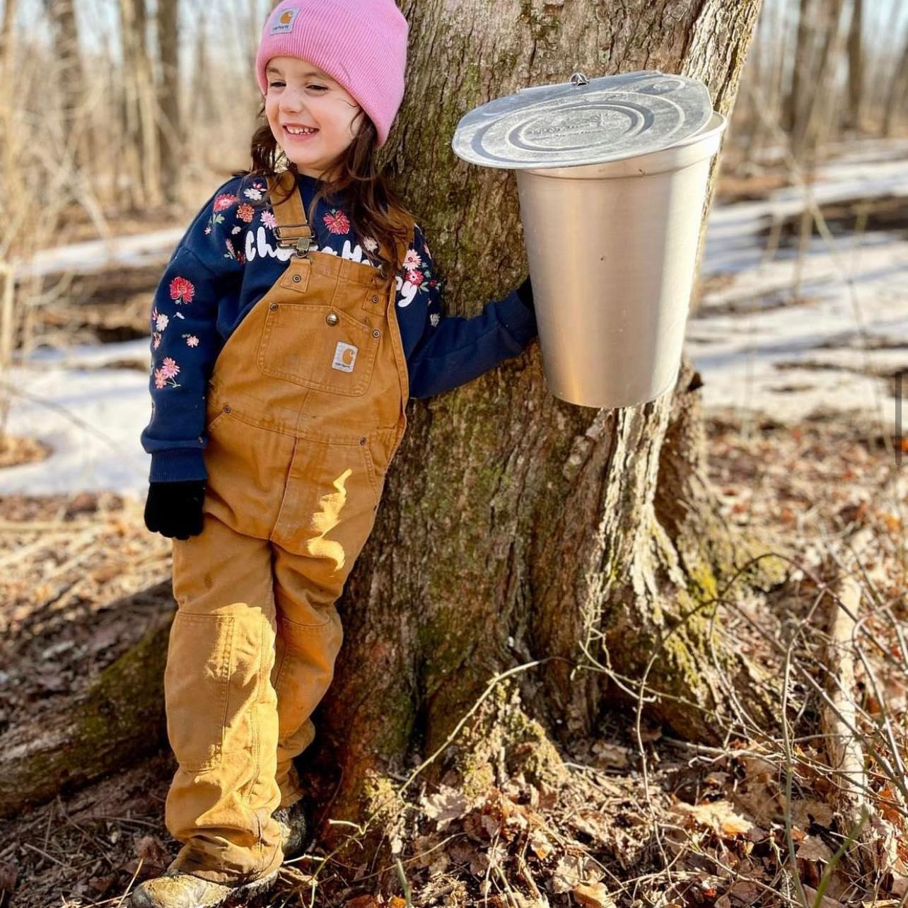In the early spring when the nights are below freezing, and the days are warm we tap our maple trees to collect their sap. We then boil the sap until it becomes delicious maple syrup! It takes around 40 gallons of sap to make one gallon of syrup!